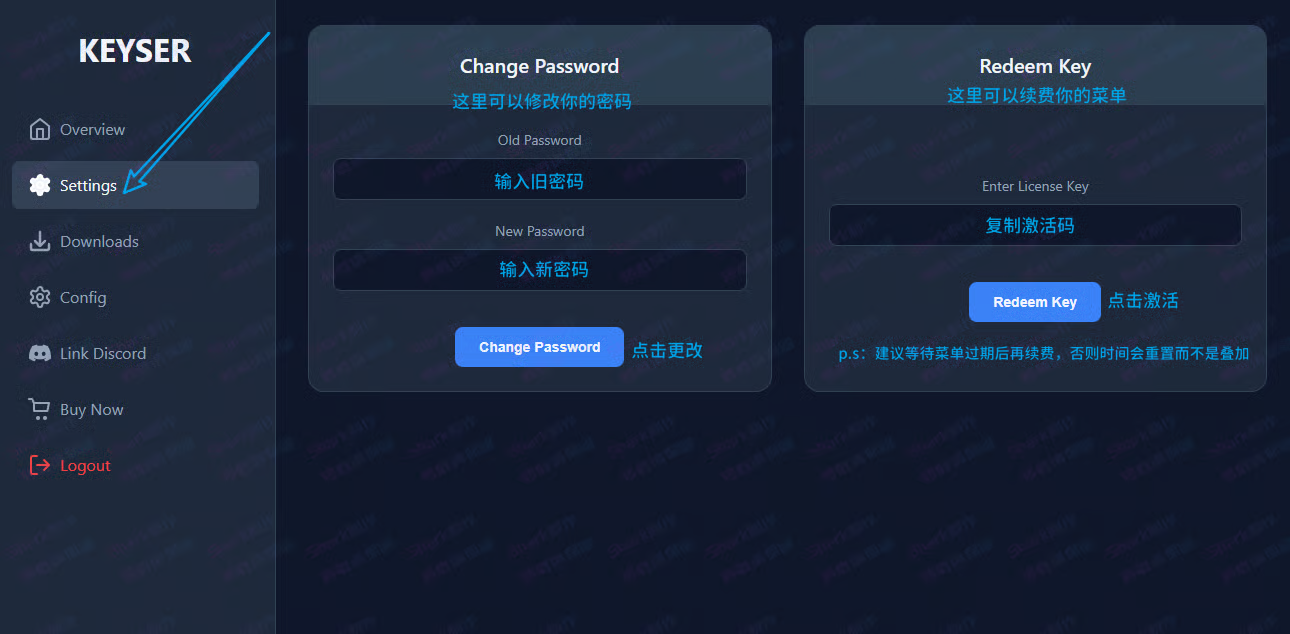 Keyser改密及续费